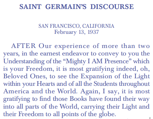 We have been with you during the past ten days, and have with the greatest of Joy felt the loving response within your Hearts. We too rejoice exceedingly. I say this that you may know it is only the beginning of the great Joy, the great Light, the great Freedom which is yours. So many have entered into It sufficiently to know there is really no limit to that which they may attain. I say to you tonight—and I try to put into it all the Love of My Being—I congratulate you Blessed Ones in San Francisco on the Expansion of your Light, in spite of the seeming chaos which at times seemed to be in your midst. Yet, steadily and surely have you gone forward, in the greater and greater Expansion and Perfection of your Presence of Life, which is your “Mighty I AM.”