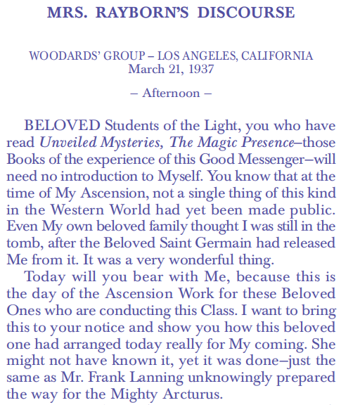 Now there are many, many among the “I AM” Students in America today who can make that same Ascension which I did, in this embodiment. Why do you suppose this Good Messenger was brought to the Cave of Symbols, permitted to witness these Transcendent Activities and to assist in one? So he might carry back to mankind the feeling of that True Reality. Jesus, the Beloved One, conveyed It to mankind two thousand years ago or more; but who believed It? Now in our Western World, our Beloved America, there has come the same proof to mankind. Today there will be further proof, because the time is not far distant when a number of the Ascended Masters will come and make Their Bodies, Their Ascended Bodies, tangible to you so that all may see and know the Truth of which the Messengers have spoken.